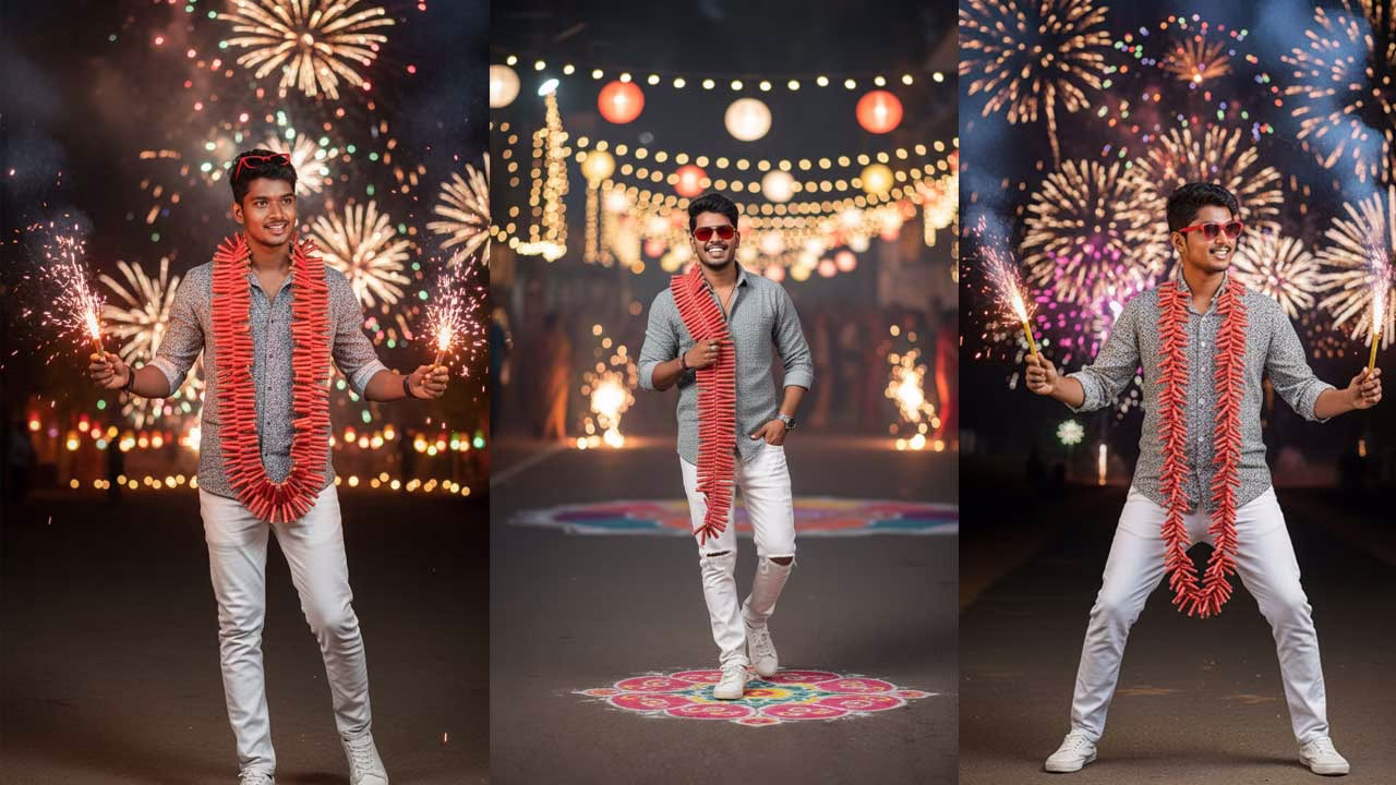 Convert it into a A stylish young man from the reference picture. Keep the facial features the same. celebration diwali, Around his neck hangs a long chain made of hundreds of small red cylindrical firecrackers tied together, resembling a continuous 1,000-shot firecracker garland used during Diwali celebrations. There should be one cracker lighting on each hand. Grey popcorn shirt, white jean and white shoe, red frame sunglasses. Standing stylish funny pose, Captured in ultra-detailed 8K resolution with sharp textures natural skin tones, realistic shadows, and a premium fashion editorial aesthetic. 100% matching my face, Background should be diwali street background, focus should be only on man.