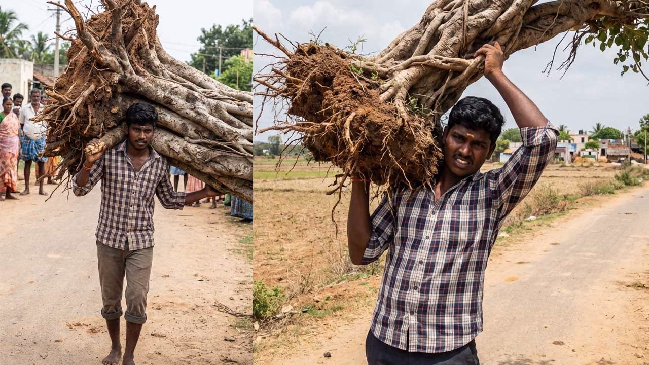 The man uprooting the banyan tree should feel grounded in reality. His posture, effort, facial expression, and clothing must align with the physical challenge of the task. Describing subtle details such as strained muscles, slow movements, and controlled breathing helps Google Flow AI animate human motion more naturally. This approach prevents exaggerated or robotic actions and instead creates a scene that feels emotionally authentic.