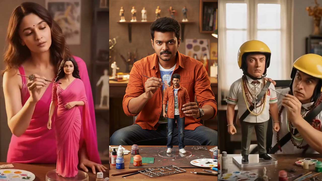 A hyper-realistic cinematic scene the uploaded person carefully painting his own figurine at a desk and make direct eye contact with camera. The figurine is standing on a transparent acrylic display base, but its size is larger than usual, making it appear more prominent and almost half the height of the real person. Both the person and the figurine wear the exact same outfit, matching in details. Around the desk, realistic painting tools, brushes, and hobby items are scattered, creating a creative workshop atmosphere. The figurine must look ultra-realistic with lifelike human skin tone, natural facial details, and premium PVC texture. Realistic indoor background, cinematic studio lighting, and sharp details.