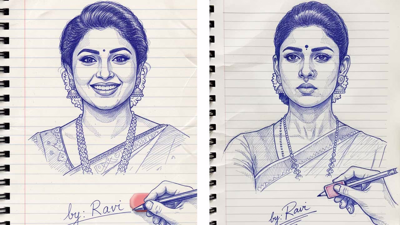 Create a photo-style line drawing sketch in ink blue and white, focusing on a face (keep the facial details exactly the same as in the uploaded reference). The artwork should have intricate detailing and a normal notebook page background. Show a right hand holding a pen and an eraser. Include a connected pencil-style signature sketch that reads “by: Ravi” with artistic scratch effects.